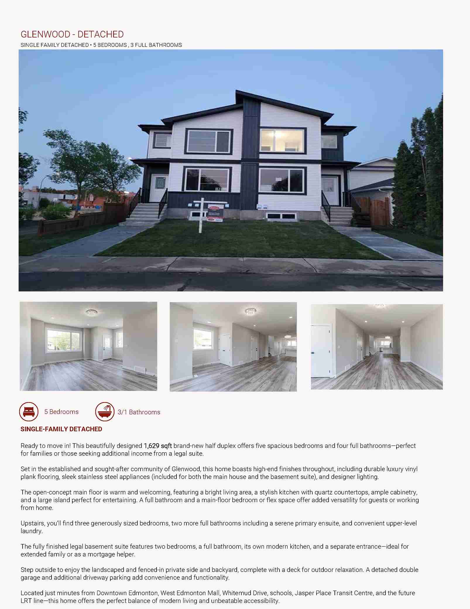 Overview: Ready to Move In! This brand new and meticulously crafted 5-bedroom, 4-bathroom half duplex with a LEGAL basement suite is nestled in the heart of the mature and sought-after Glenwood neighbourhood. Offering 1,629 Sqft of modern living space plus a fully finished legal suite, this home is ideal for families, investors, or those seeking multigenerational living solutions.