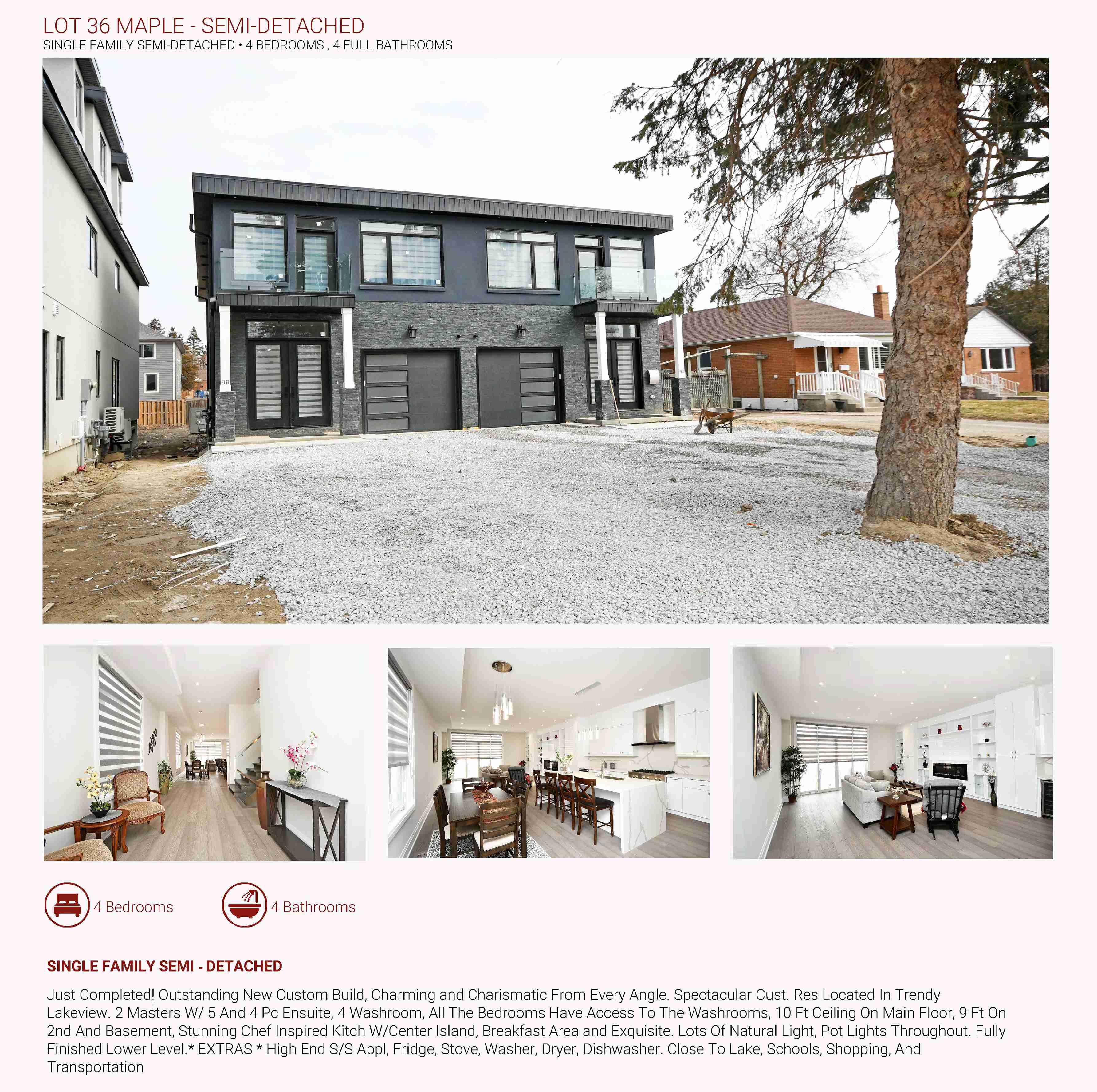 Overview: Just Completed! Outstanding New Custom Build, Charming & Charismatic From Every Angle. 2,426 Sqft + Basement. Spectacular Cust. Res Located In Trendy Lakeview. 2 Masters W/ 5 And 4 Pc Ensuite, 4 Washroom, All The Bedrooms Have Access To The Washrooms, 10 Ft Ceiling On Main Floor, 9 Ft On 2nd And Basement, Stunning Chef Inspired Kitch W/Center Island, Brkfst Area&Exquisite. Lots Of Natural Light, Pot Lights Throughout. Fully Finished Lower Level. Extras: You Won’t Be Disappointed In This Beauty! High-End S/S Appl, Fridge, Stove, Washer, Dryer, Dishwasher. Close To Lake, Schools, Shopping, And Transportation.